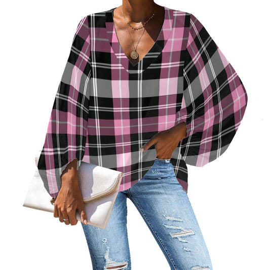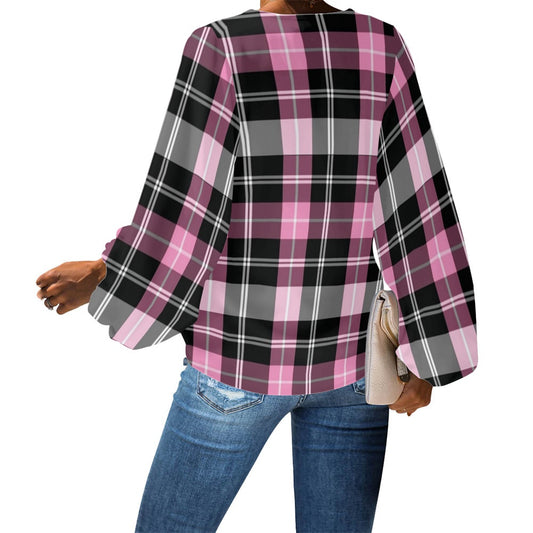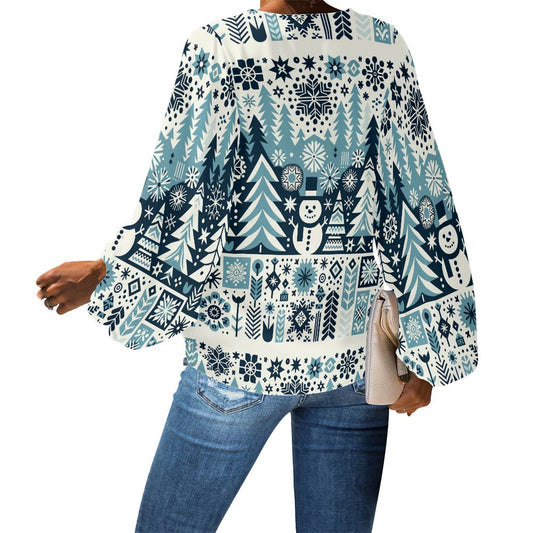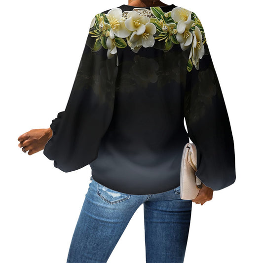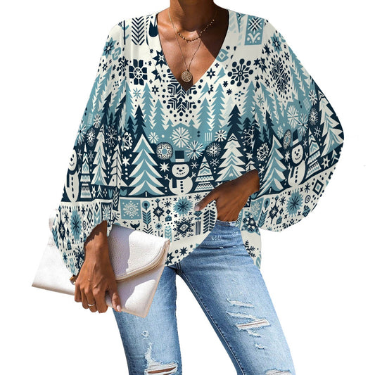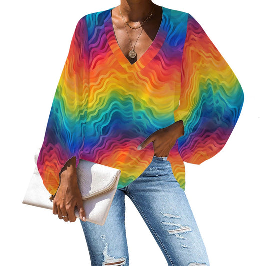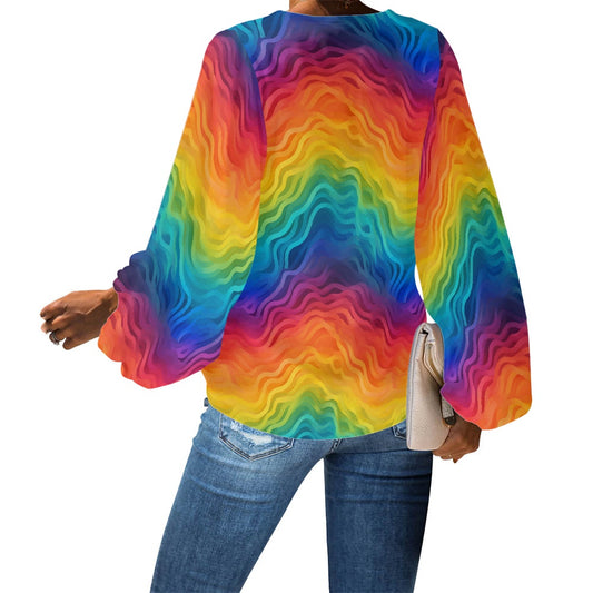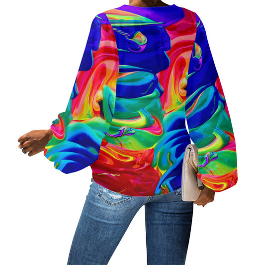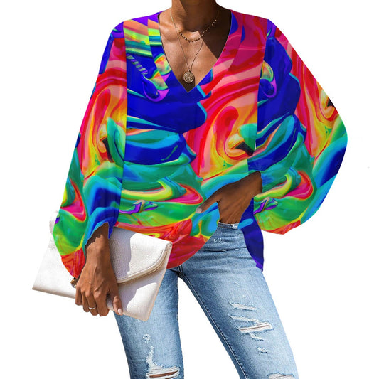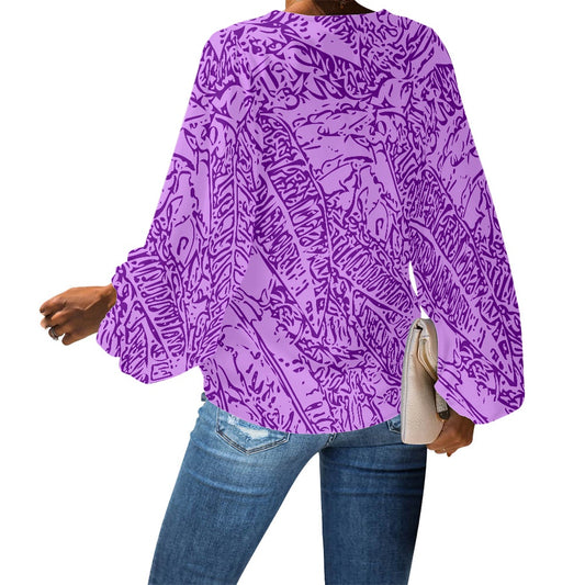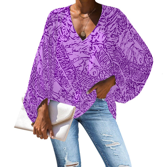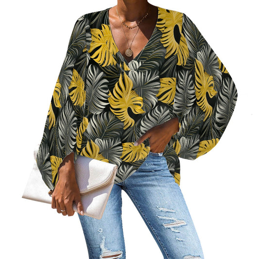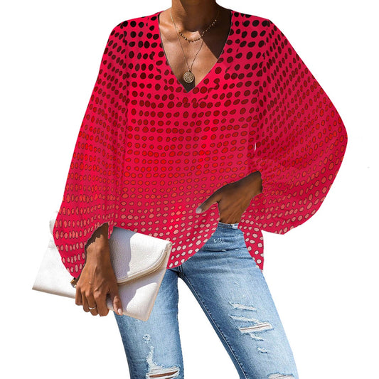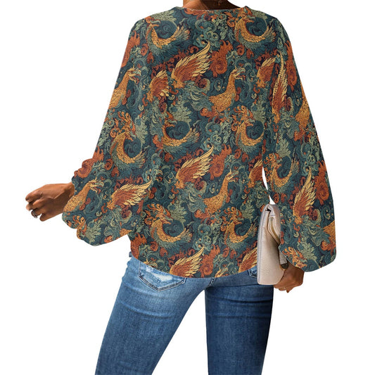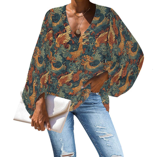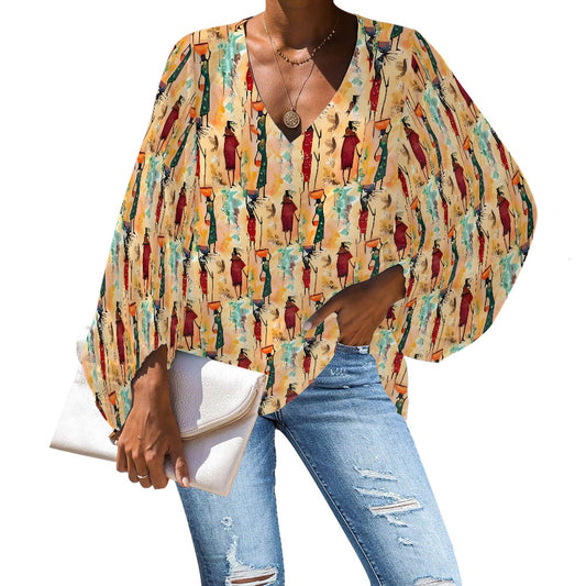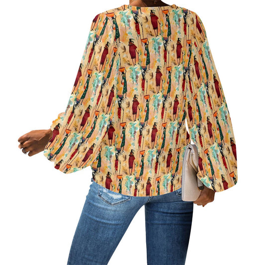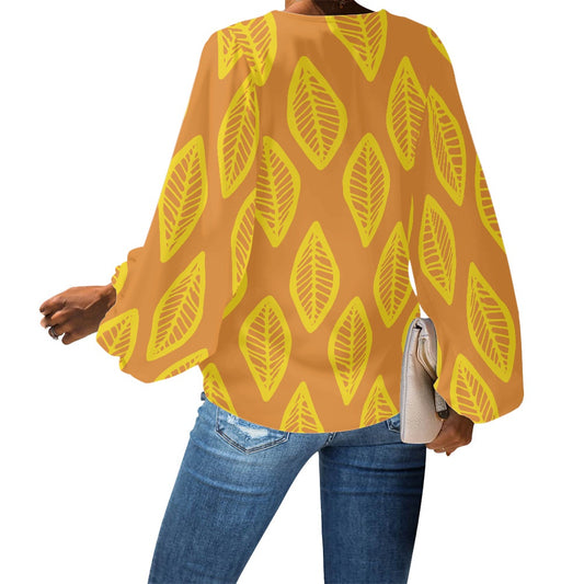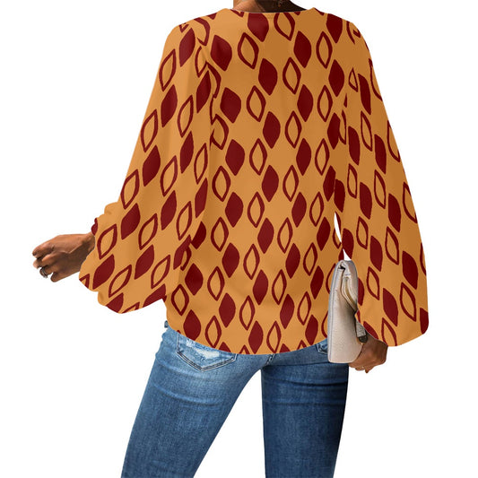 Orange MudCloth V-Neck Puff Sleeve Chiffon Blouse