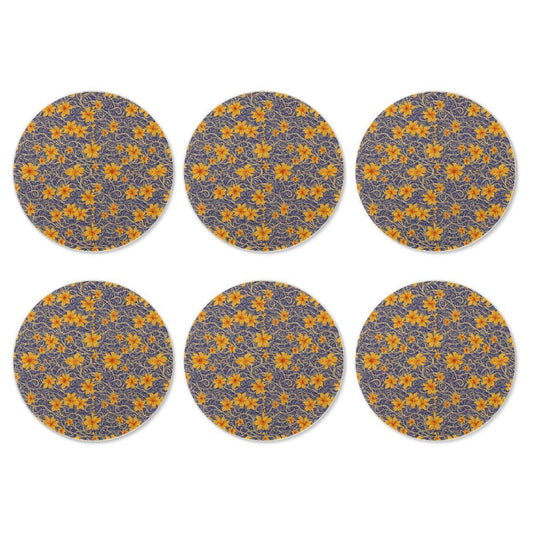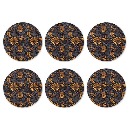 6 Pieces Cup Mats Set - Coasters - Gold Flowers Woodcut