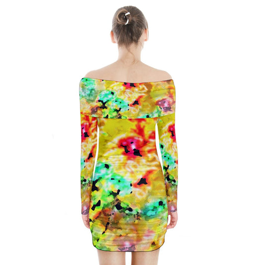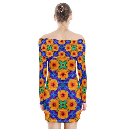 Hibiscus Impressionist Long Sleeve Off Shoulder Dress