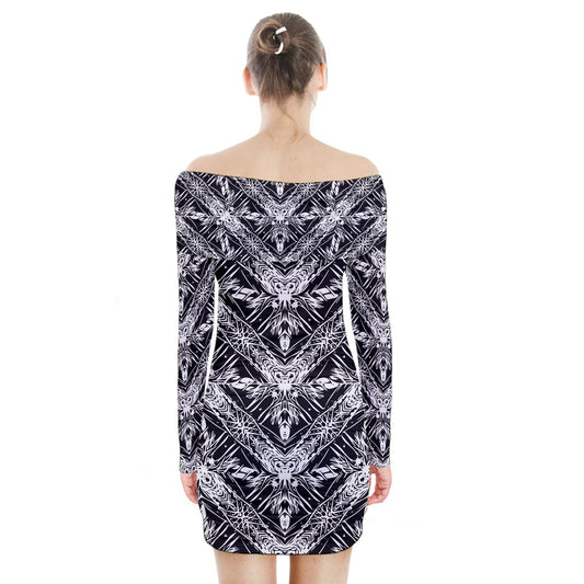 Black and White Fern Long Sleeve Off Shoulder Dress