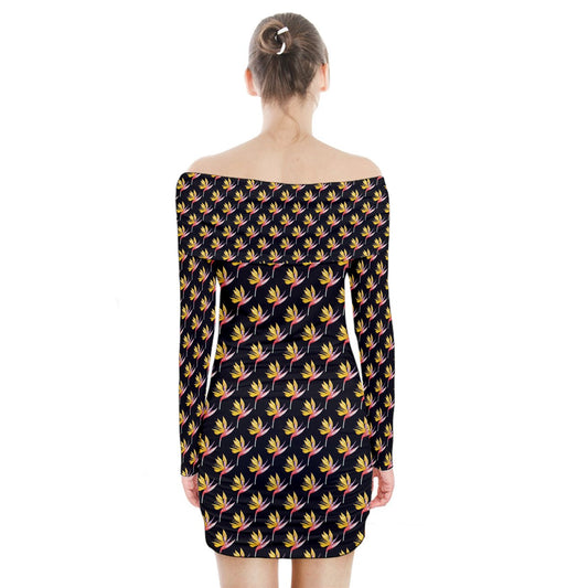 Long Sleeve Off Shoulder Dress Bird of Paradise on Black
