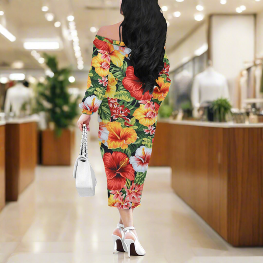 Hibiscus Women's Long Sleeve Off-Shoulder Dress - Floral Elegance, Perfect for Dinners and Special Occasions