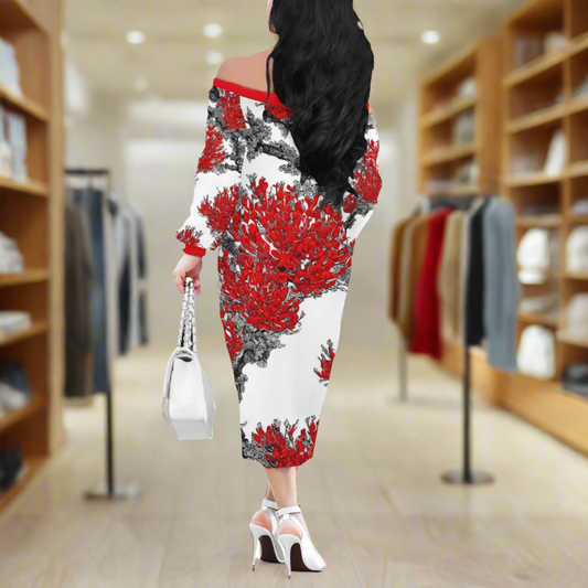 Red Puakenikeni Women Long Sleeve Off Shoulder Midi Dress