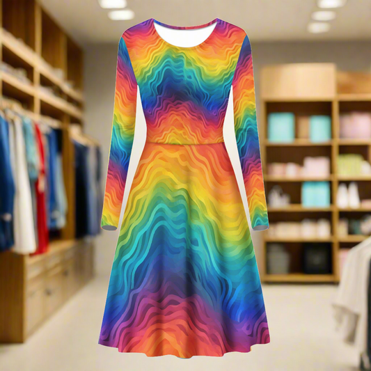 Rainbow Painting Women Scoop Neck Long Sleeve Ruffle Dress