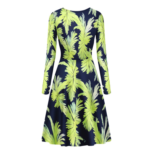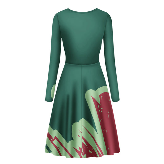 Ultramarine Green, Green Ash & Watermelon Women V-Neck Long Sleeve Ruffle Dress