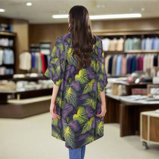Luxtrini Iridescent Syngonium: Purple and Yellow Half Sleeves Knee-length Open Front Cardigan