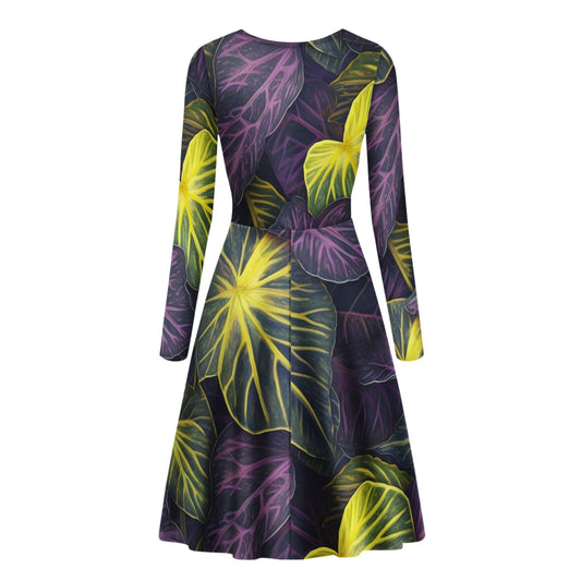 Luxtrini Iridescent Syngonium: Purple and Yellow Women's Long Sleeve Off-Shoulder Dress - Elegant, Botanical Inspired, Perfect for Various Occasions