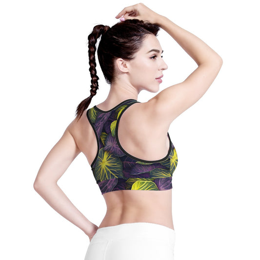 Luxtrini Iridescent Syngonium: Purple and Yellow Women Sports Bras Black Binding