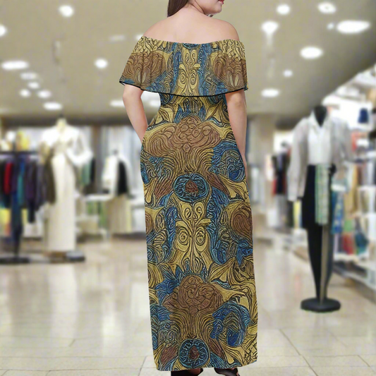 African Ethnic Blue Gold Brown Women Off Shoulder Maxi Dress