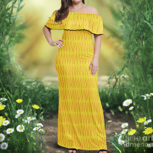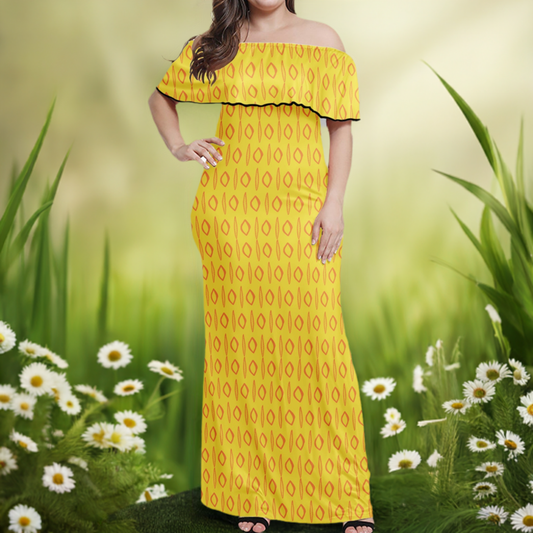 African Ethnic Mudcloth Yellow Women Off Shoulder Maxi Dress - Sizes up to 7XL