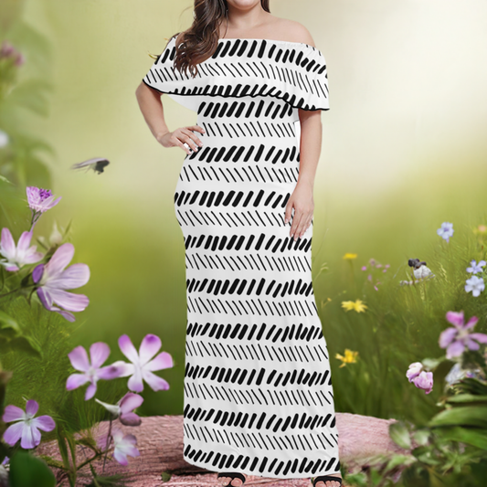 African Ethnic Mudcloth Black and White Women Off Shoulder Maxi Dress - Sizes up to 7XL