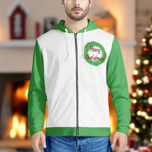 Men's Merry Christmas Zip-Up Hoodie - Festive Green Accent | Cozy & Warm Holiday Wear