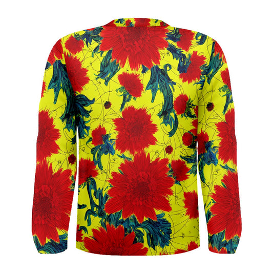 Customizable Men's Long Sleeve Tee - Red Flowers on Yellow - 90% Cotton, 10% Spandex