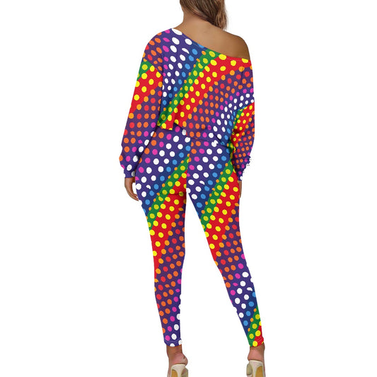 LGBTQ-Friendly Rainbow Polka Dot Trendy Two-Piece Set: Cropped Off-Shoulder Jacket and High-Waisted Leggings by Luxtrini