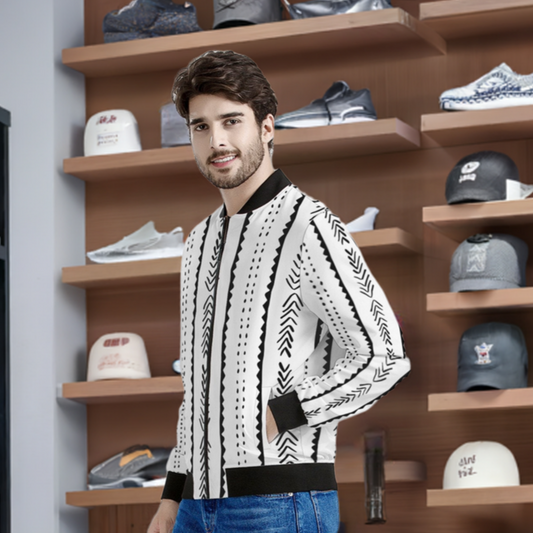 Men's Handmade Ethnic Mudcloth Bomber Jacket in Black and White