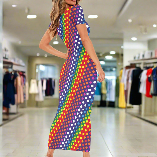 LGBTQ-Friendly Rainbow Polka Dot Elegant Form-Fitting Short Sleeve Midi Dress with Round Neckline – Tailored for Curves by Luxtrini