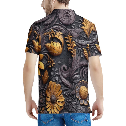 Gold Flowers Woodcut Men's All Over Print Polo Shirt