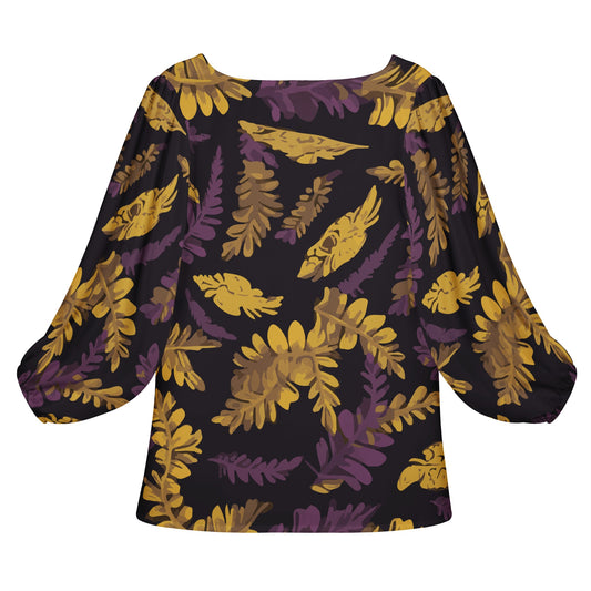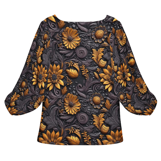 Gold Flowers Woodcut Women Long Sleeve Puff Sleeve Blouse