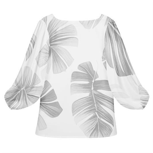 White Monstera Women Long Sleeve Puff Sleeve Blouse