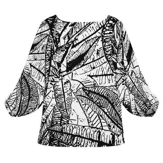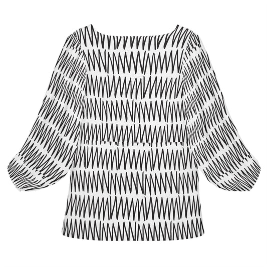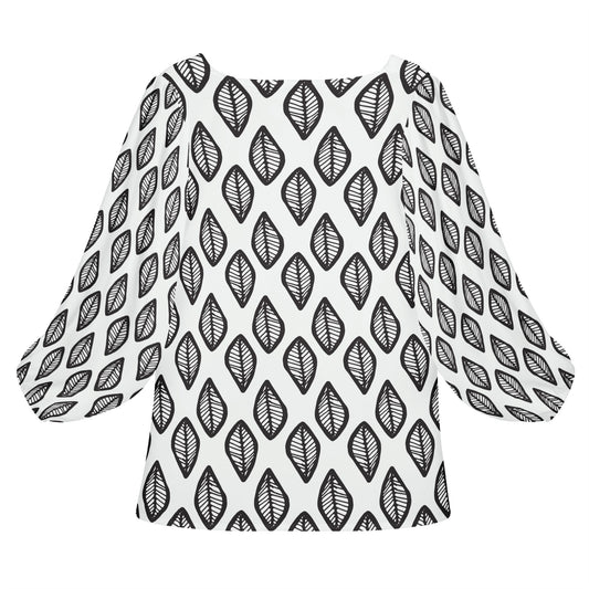 Black and White Croton Women Long Sleeve Puff Sleeve Blouse