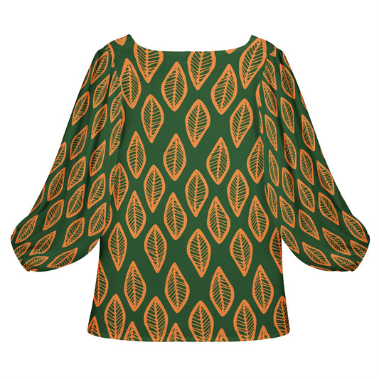 African Ethnic MudCloth #16 Green and Orange Women Long Sleeve Puff Sleeve Blouse