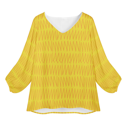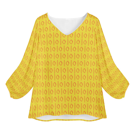 African Ethnic Mudcloth #14 Yellow Women Long Sleeve Puff Sleeve Blouse