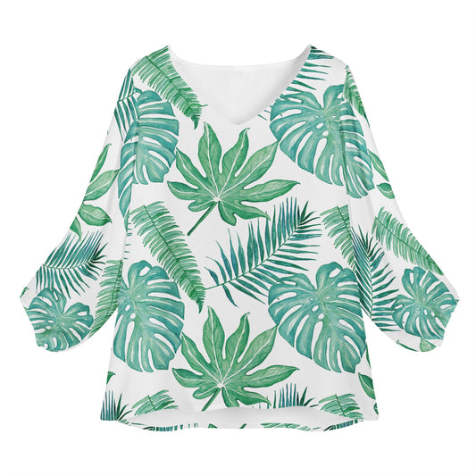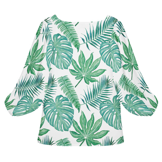 Palm and Monstera Leaf Green Pattern Women Long Sleeve Puff Sleeve Blouse