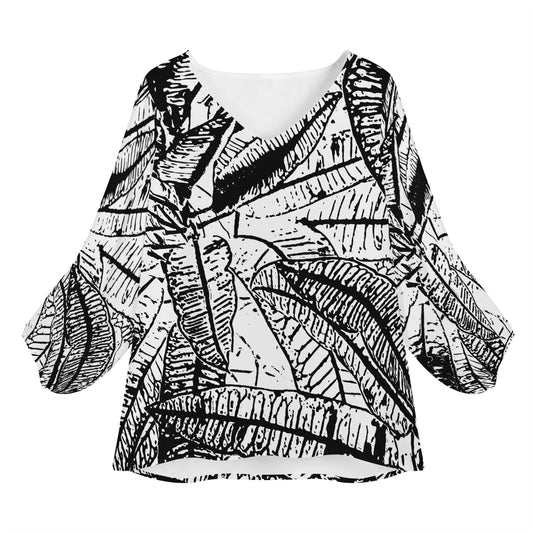 Black and Gold Palm Branches Women Long Sleeve Puff Sleeve Blouse