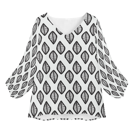 African Ethnic Mudcloth #16 Black and White Women Long Sleeve Puff Sleeve Blouse