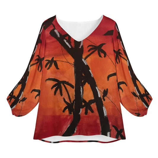 Bamboo at Sunset Women Long Sleeve Puff Sleeve Blouse