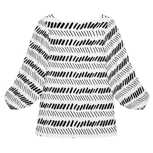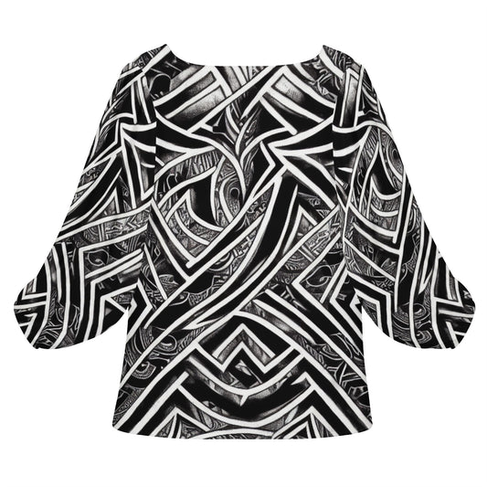 Black and White Polynesian Women Long Sleeve Puff Sleeve Blouse