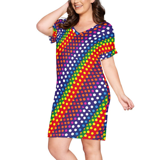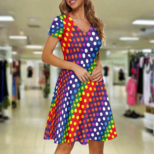 LGBTQ-Friendly Rainbow Polka Dot Relaxed Fit V-Neck Dress with Short Sleeves - Perfect Everyday Wear for Women by Luxtrini