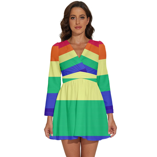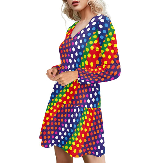 LGBTQ-Friendly Rainbow Polka Dot Playful V-Neck Mini Dress with Ruffled Hem and Puffed Long Sleeves by Luxtrini