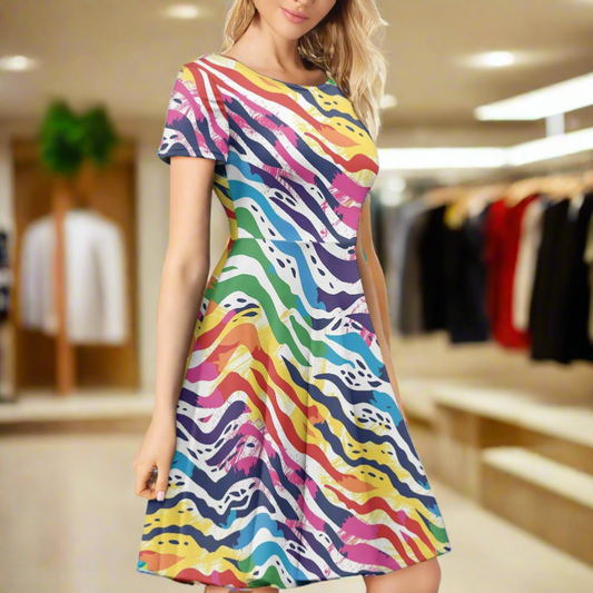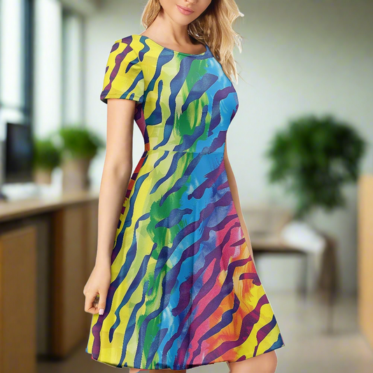 Luxtrini Rainbow Animal Print Womens Scoop Neck Short Sleeve Ruffle Dress - Vibrant, Custom Handmade, Perfect for All Occasions