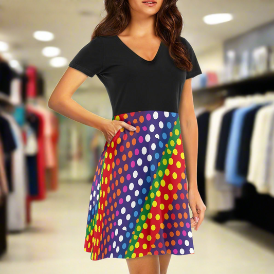 LGBTQ-Friendly Rainbow Polka Dot V-Neck Black Top Women short Sleeve Ruffle Dress by Luxtrini