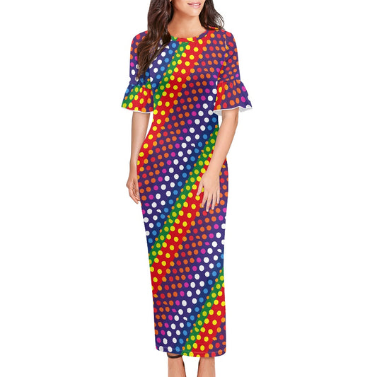 LGBTQ-Friendly Rainbow Polka Dot Stylish Scoop Neck Ankle-Length Dress with Unique Ruffled Sleeves for Women by Luxtrini