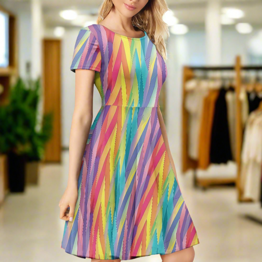 Pastel Chevron Rainbow Stripes Women Scoop Neck Short Sleeve Ruffle Dress