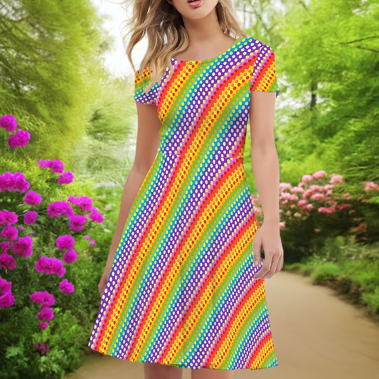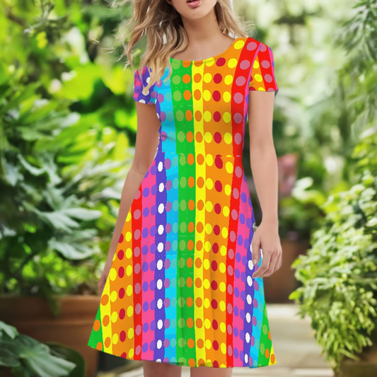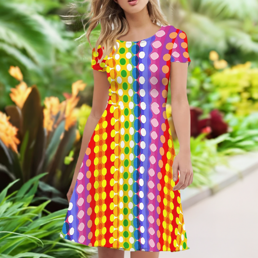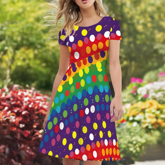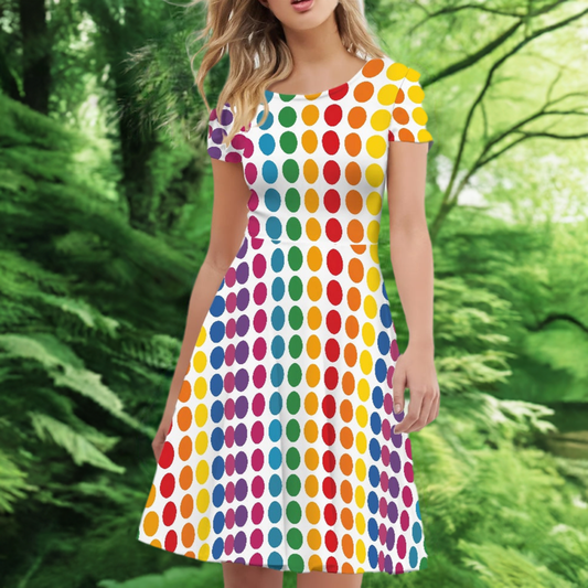 Rainbow Polka Women Scoop Neck Short Sleeve Ruffle Dress