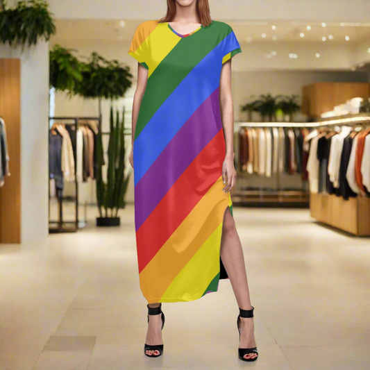 Rainbow Short-Sleeved Slit Dress - V-Neck, Ankle-Length, Perfect for Summer Parties and Vacations