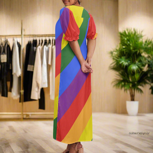 Rainbow Puff Sleeve Dress – Flowy Pride Midi, Short Sleeves & Slim Waist – Colorful Festival or Summer Outfit