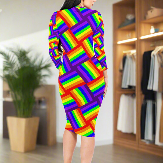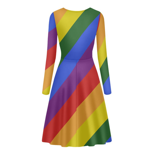 Rainbow Pride Long Sleeve Dress | Women's Colorful Striped Mini Dress with Round Neckline | Casual to Formal Wear | High-Resolution Pride Flag Inspired Fashion