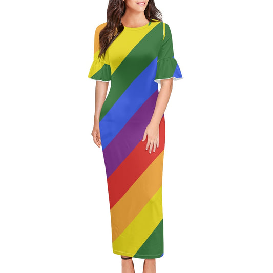 Rainbow Stylish Scoop Neck Ankle-Length Dress with Unique Ruffled Sleeves for Women