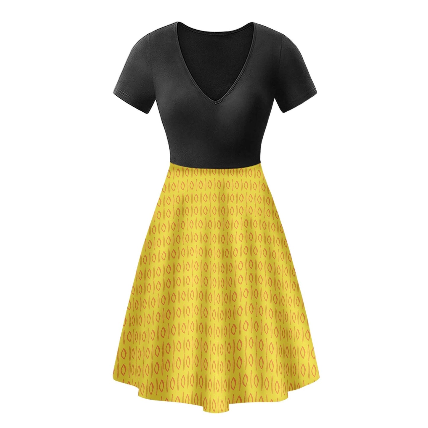 African | Ethnic | Yellow | Black V-Neck Women Ruffle Bottom Dress