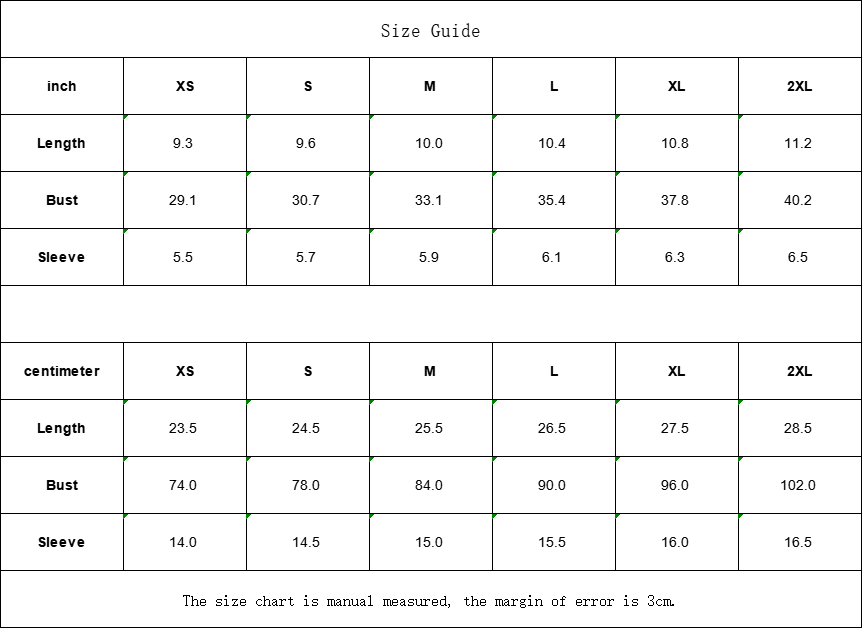 - XS: Length 9.3", Bust 29.1", Sleeve 5.5"
