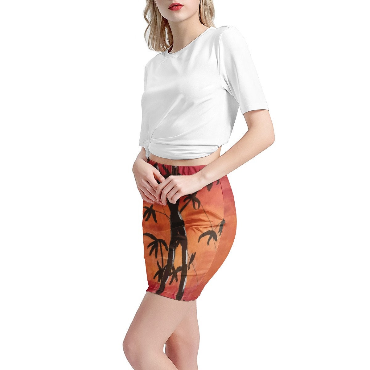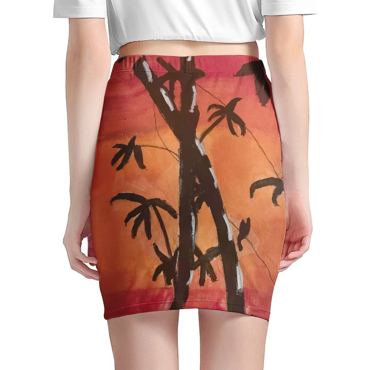 - Inspiring Origin: This skirt showcases "Bamboo at Sunset," a captivating painting by the talented young artist, Alisa. Painted in acrylic on canvas, her work brings a unique artistic touch to your wardrobe.