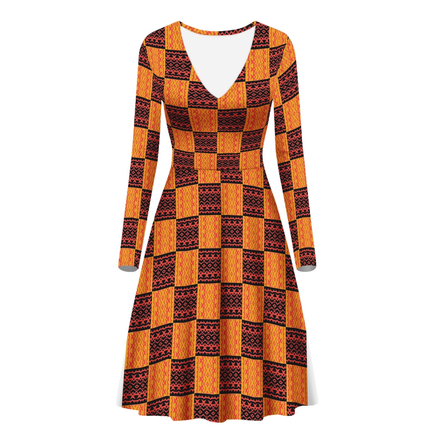 Black and Orange Tribal Design - Women V-Neck Long Sleeve Ruffle Dress