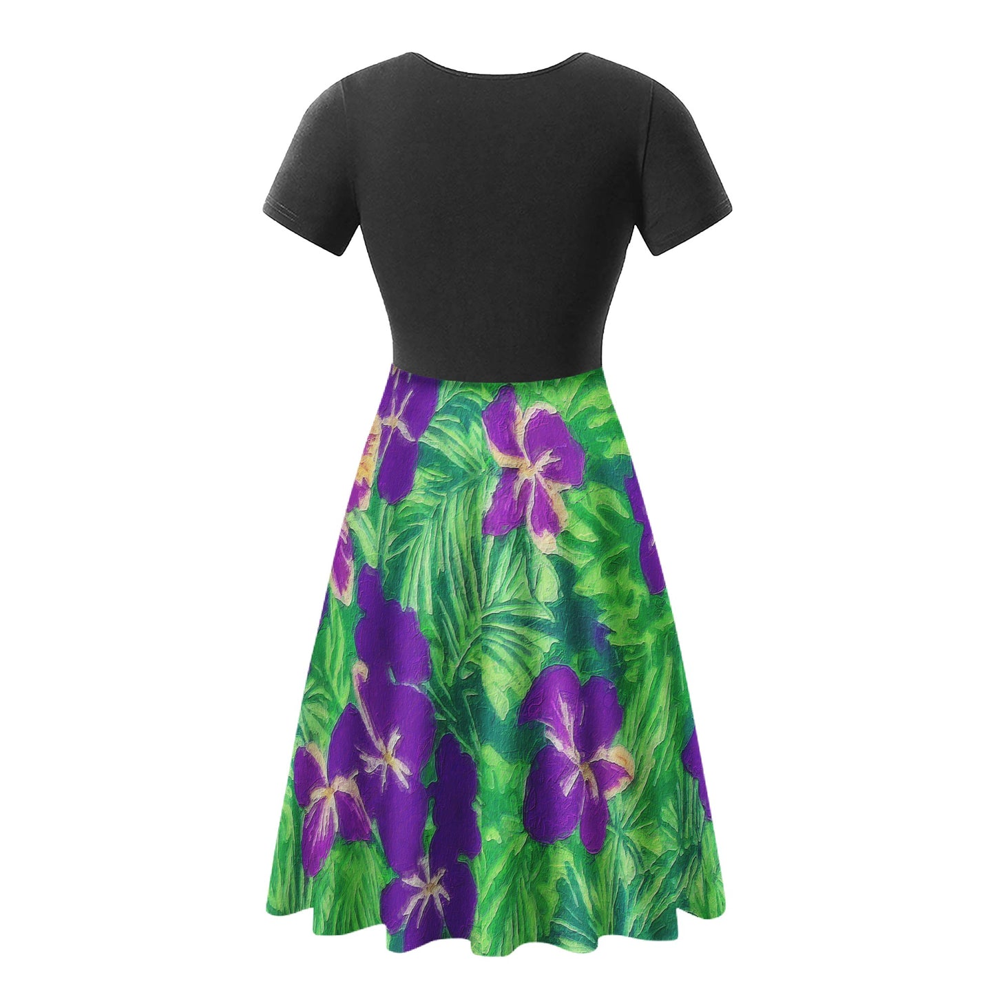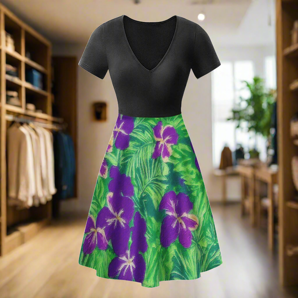 Blue Flag Iris Black V-Neck Women Ruffle Bottom Dress