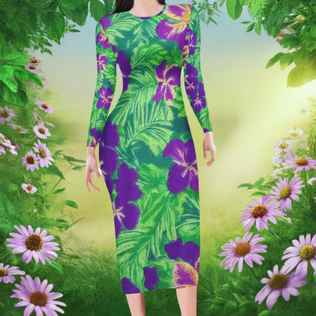 Blue Flag Iris on Green Women Bodycon Midi Sheath Dress - up to 4XL