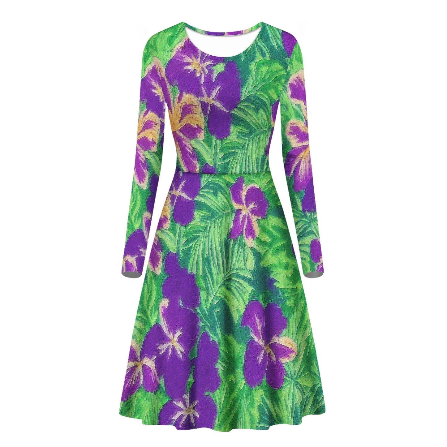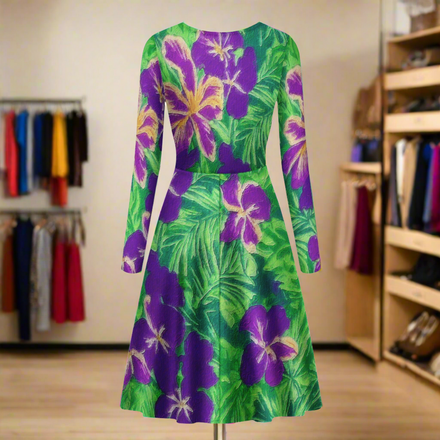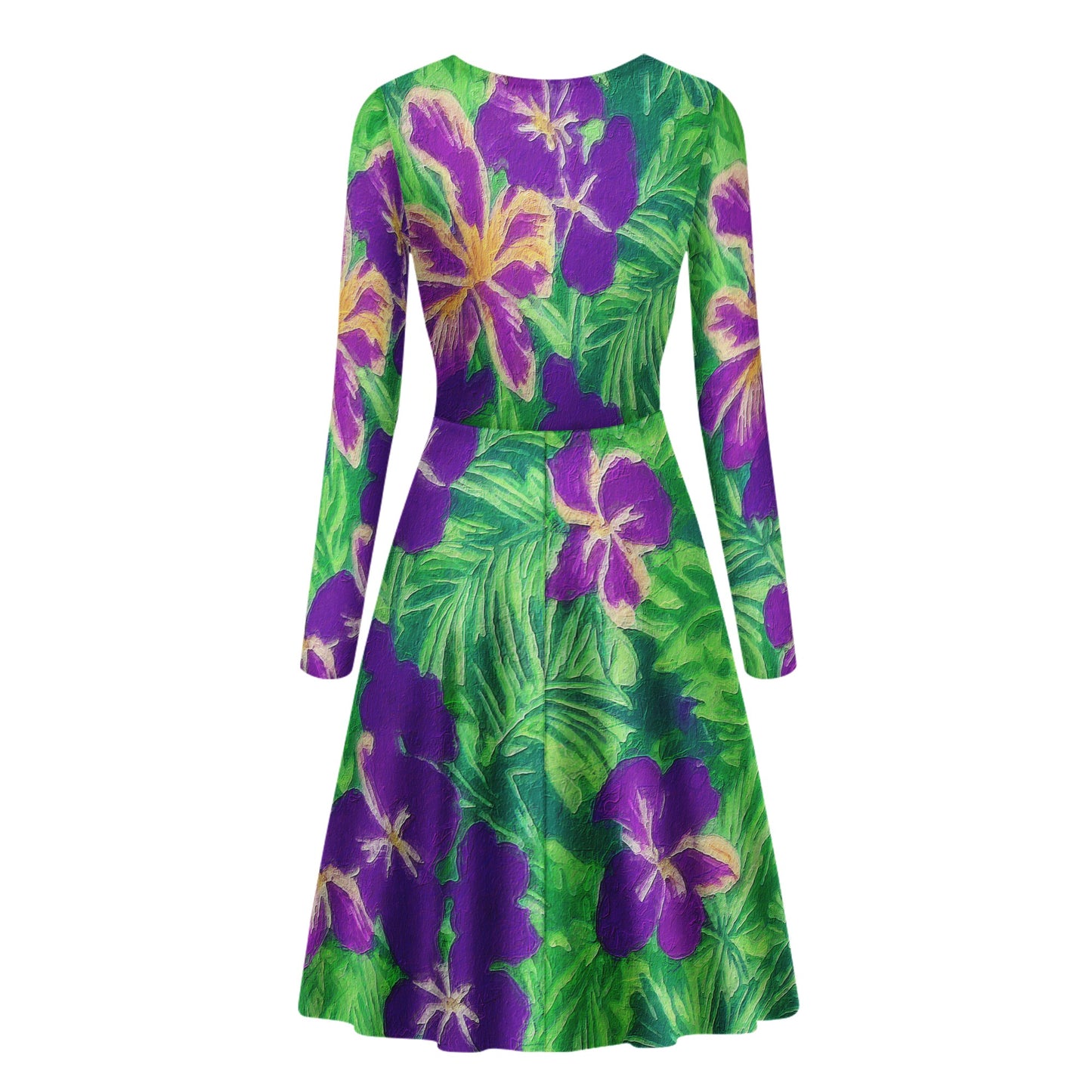 Blue Flag Iris Long Sleeve Scoop Neck Ruffle Dress - Women's Custom Dress