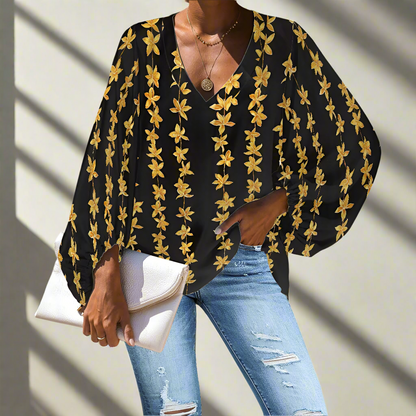 Luxtrini Black and Gold Floral Blouse – Lightweight V-Neck Chiffon Top Puff Sleeve Blouse by Luxtrini